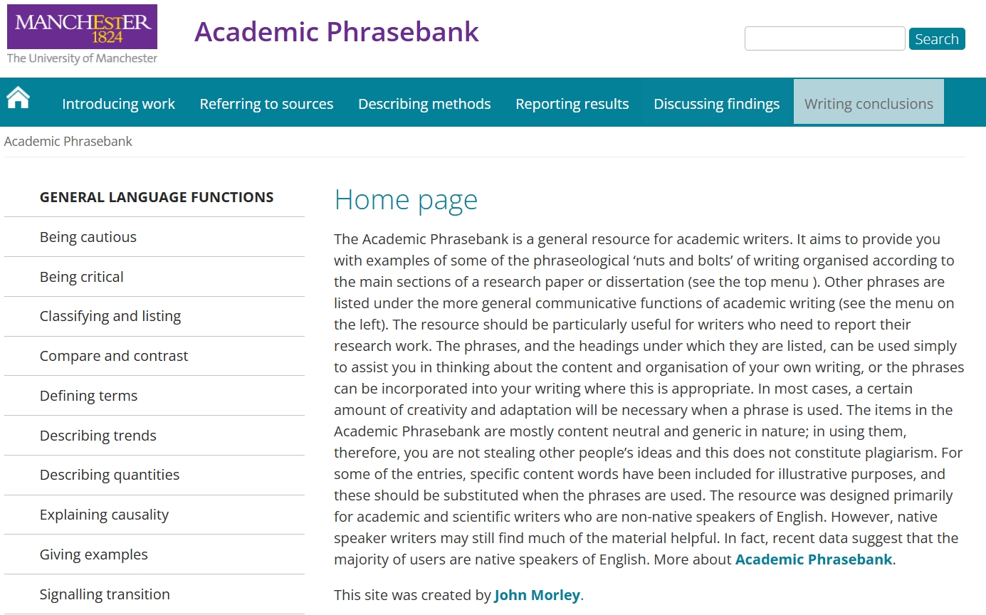 Academic Phrasebank是由英国曼彻斯特大学的John Morley博士创建的一个专门针对学术论文写作的词句模板库。它旨在帮助学术写作者,尤其是母语非英语的研究者,提高他们的英文学术写作水平。
